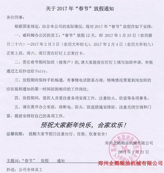 關于鄭州企鵝2017年春節放假通知