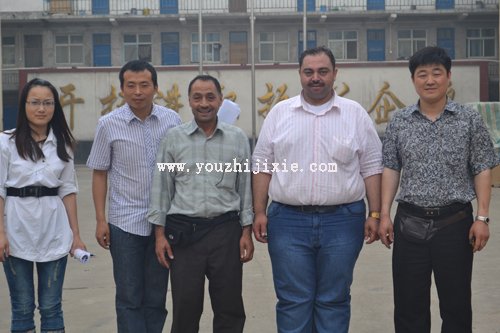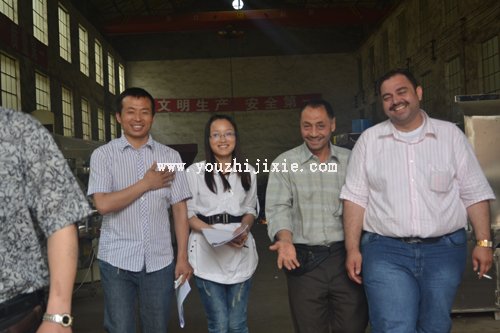 圖為明經理陪同客戶參觀我們的廠房!90噸大豆預處理浸出生產線順利成交!